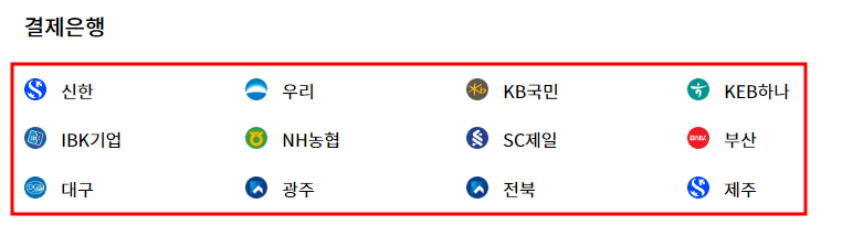 아래에 해당하는 은행들은 결제은행으로 지정이 가능하니 참고 바랍니다.