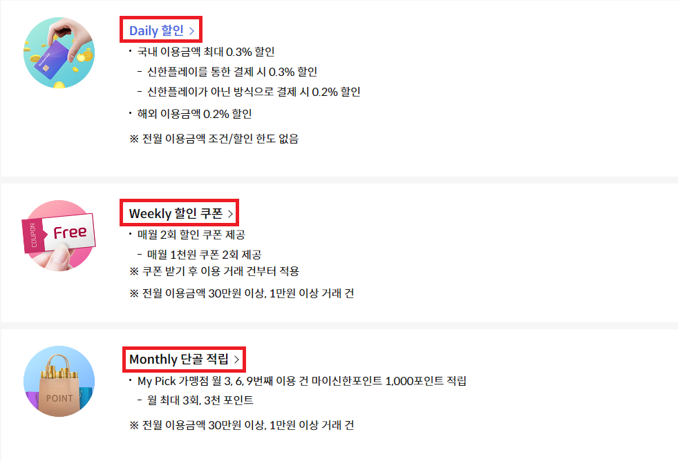 데일리 할인은 전월 실적 조건 없이 모두 해당이 되고 위클리의 경우 전월 30만원 이상 사용, 위클리+먼슬리의 경우 건당 1만원 이상이어야 할인, 적립 혜택을 적용받으실 수 있습니다.
