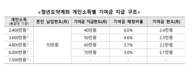 만 19세~34세 청년 중 특정 소득 기준을 충족하는 분들에 한해 매달 70만원 이내로 저축을 하면 약 5,000만원 정도의 자금을 모을 수 있는 프로그램입니다.