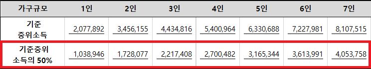 가구 소득 인정액이 기준 중위소득 50%에 해당되며 아래 표의 소득 기준은 세전 금액을 기준으로 합니다.